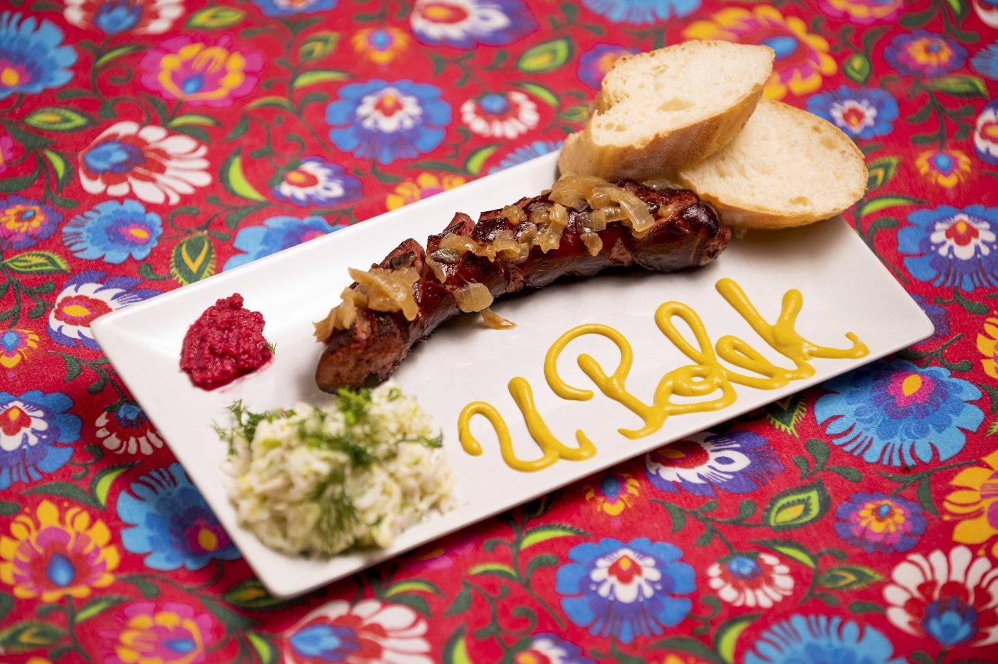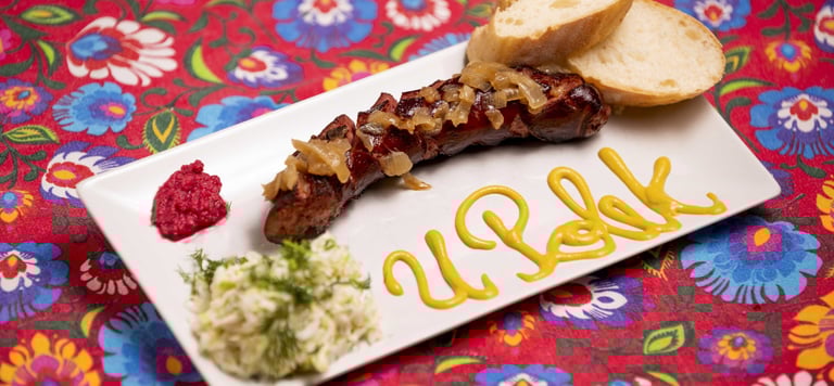 Auténtica salchicha polaca ahumada, hecha a la sartén y acompañada de kolesław y salsas