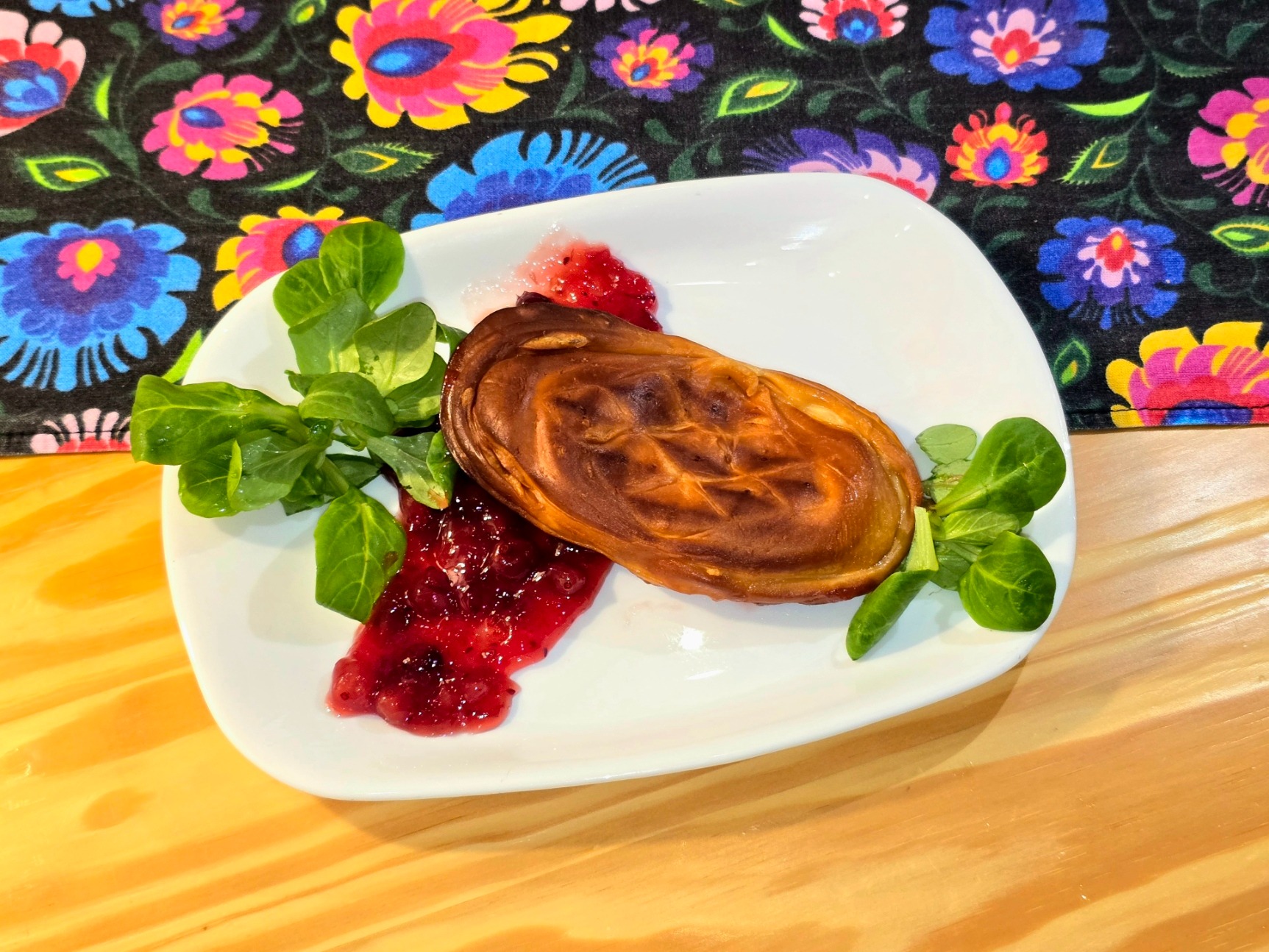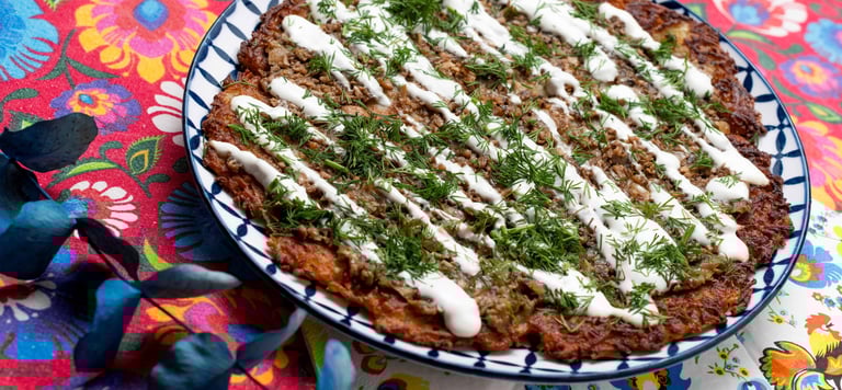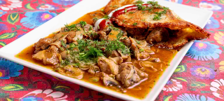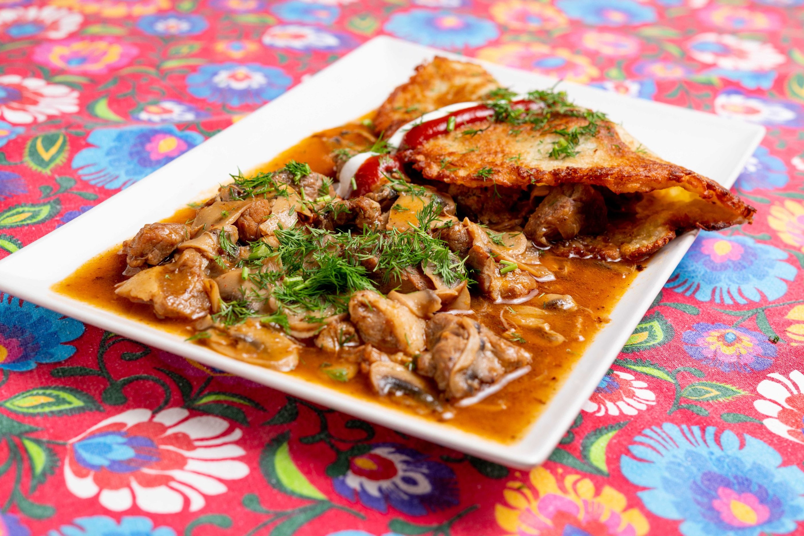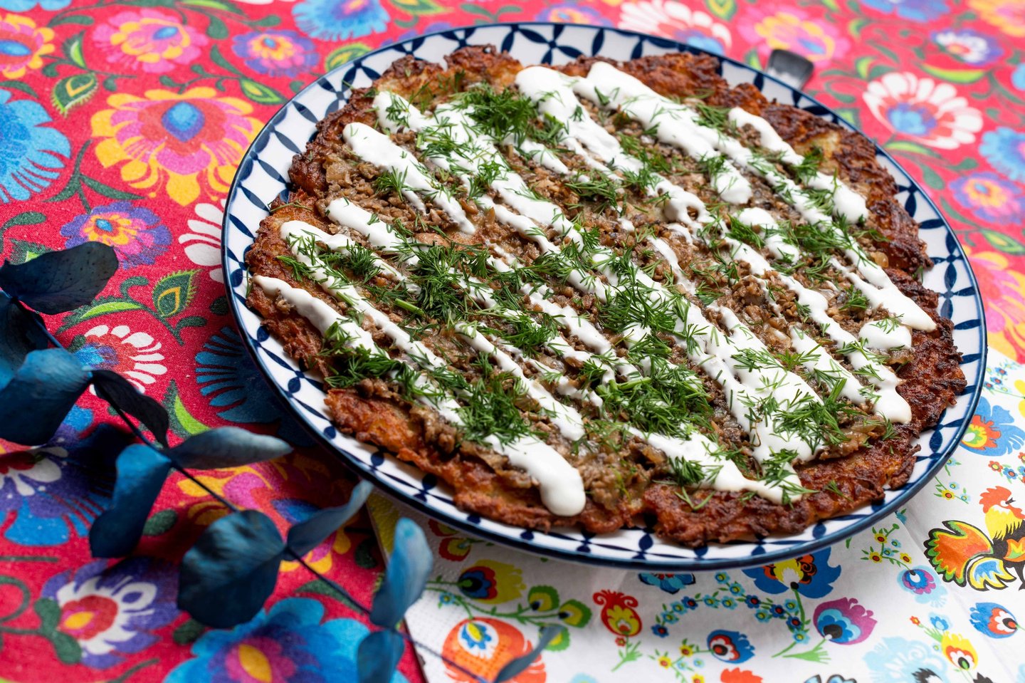 Torta de patata con Gulasz, un estofado de carne con verduras