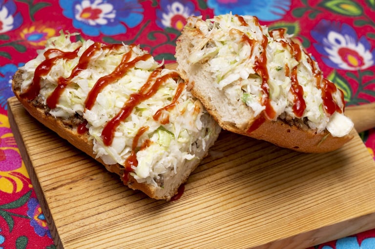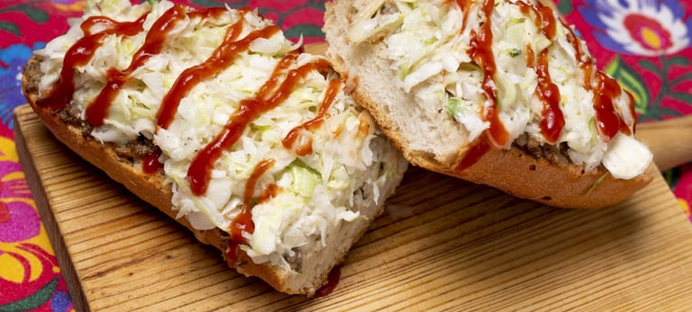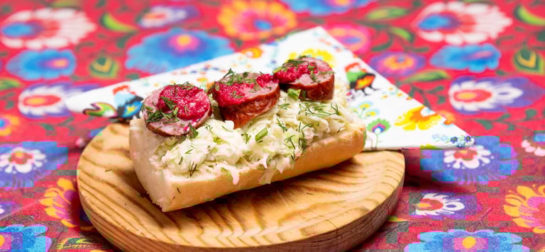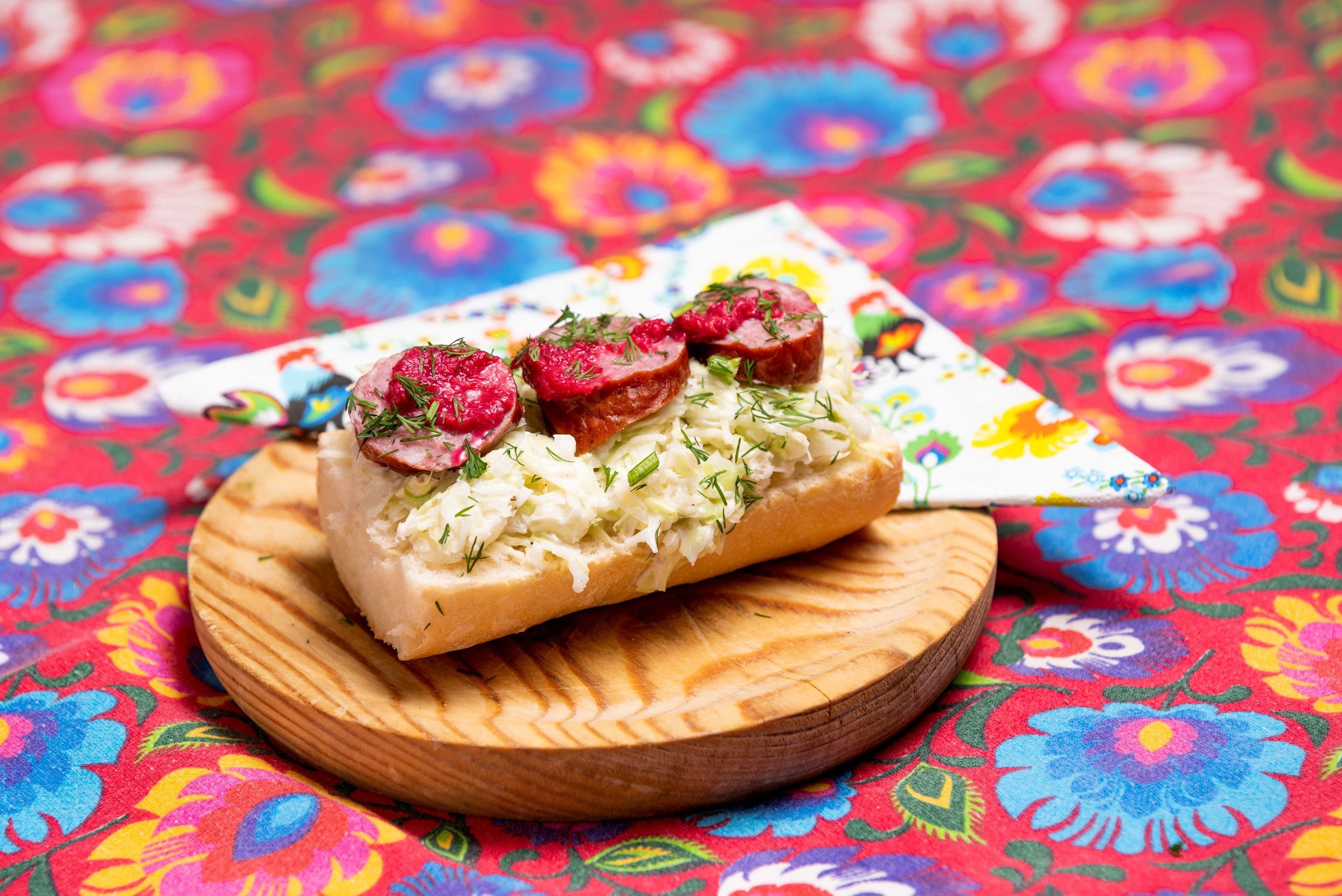 Montadito de salchicha ahumada con kolesław y salsa de rábano y remolacha