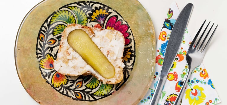 Pan casero untado de manteca de cerdo preparada por nosotras y cubierto por pepino fermentado