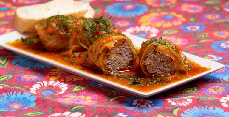 2 rollos de carne picada con arroz y especias, envueltos en una hoja de col y bañados en salsa de tomate